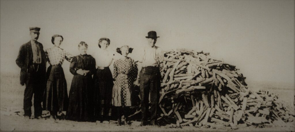 Geir, Sigríður, Sesselja Rakel, Halldóra, Björg og Kristján William. Fjölskyldan stendur við eldiviðarhrúgu sem var dýrmætasta eign sérhvers frumbyggja á hverju hausti landnámsáranna. Mynd RbQ