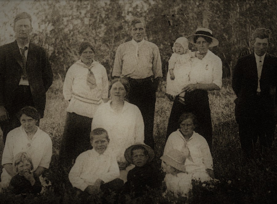 Back row: Steingrímur Brynjólfsson, Halldóra S. Magnúsdóttir,wife of Stefán P. Sigurjónsson, Jón Stefán (Steve) Magnússon, his wife Jósefína holding a child, and lastly Haraldur Brynjólfsson. Kneeling: Steingrímur’s wife Kristjana Jakobína (Bina) Westdal, Ella Johnson, and Margrét Johnson. Children in the front are Einar Johnson, Ingi Sigurjónsson, Kári Sigurjónsson, and lastly Florence Johnson. Photo: RbQ