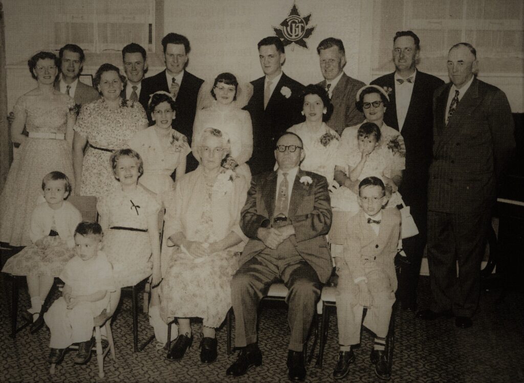 Standing: Esther and her husband Arthur, then Leo and his wife Olga, Páll and his wife Yvonne, then Gerry’s wife Joyce, Ted and his wife Isobel, then Allan and his wife Irene, holding their daughter Geraldine, and finally a family friend, John HP Johnson. Sitting are the children of Esther and Arthur, Debra, Karen, Kurt. Then Magnúsína and Guðmundur and finally Gordon, Allan’s son. Photo taken in 1955. RbQ