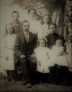 Back row Jón, Magnúsína Sigurrós and Anna Þorbjörg. Hjörný in front of Jón and Arnfríður standing between her parents. Snjólaug is probably holding Vigfús. Photo Private Collection